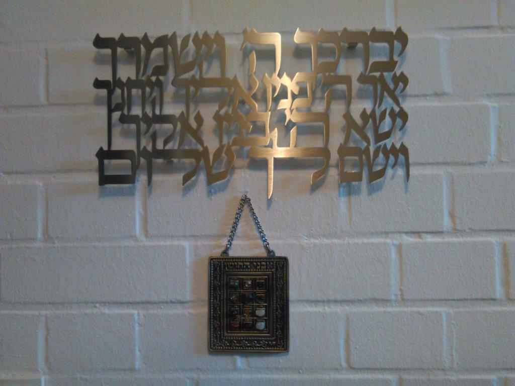 Dieser wunderbar gestaltete Segen der Kohanim (Birkat Cohanim), gestern frisch gelasert in Edelstahl direkt aus Israel hier eingetroffen, schmückt nun meinen Eingangsflur. Darunter habe ich den Choshen gehängt, den Brustschild des Hohepriesters. Er ist besetzt mit 12 Edelsteinen, die für die 12 Stämme Israels stehen: Ein würdiger Haussegen.