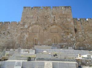 Wenn man sich dem Tempelberg von der Seite des Ölbergs aus nähert, gerät man auf einen muslimischen Friedhof, der das gesamte Goldene Tor weiträumig umgibt. Mit diesem Goldenen Tor hat es eine besondere Bewandtnis, denn Es ist es, durch das der Messias nach jüdisch-messianischer Lesart am Jüngsten Tag vom Ölberg aus in seine heilige Stadt schreiten wird um auf dem Tempelberg den dritten Tempel zu errichten. Aus Angst davor und zur Abschreckung der jüdischen Priester haben es die Muslime im 16. Jahrhundert zugemauert, um dem Messias den Durchgang zu verwehren. Der christliche Messias soll der Überlieferung nach am „Palmsonntag“ durch dieses Tor auf einem Esel reitend in die Heilige Stadt eingezogen sein. Nun aber fürchten die Muslime um ihre Vorherrschaft auf dem Tempelberg, wenn sich jemand diesem Tor nähert, denn er könnte ja der jüdische Messias sein und dieses Tor auf magische Weise aufbrechen, daher ist Nähern strengstens verboten, vor allem für Juden. Für einen abendländisch aufgeklärten Menschen sind diese Gedanken schwer nachzuvollziehen, aber hier in Jerusalem bilden sie eine handfeste Faktizität, auf die sich ganze politische Systeme stützen.