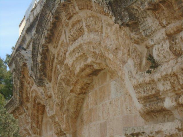 Da mich dieser ganze religiöse Wahn nichts angeht, habe ich es also gewagt, mich sowohl von der Ölbergseite als auch von der Seite des Tempelbergs diesem magischen Tor bis auf wenige Meter zu nähern, weiter geht es nicht, da an der Ölbergseite ein hoher Zaun steht, am Tempelberg ein tiefer Graben, da das Bodenniveau heute höher liegt als zur Entstehungszeit. Unter mächtigem Gezeter der Aufpasser der Jerusalemer Waqf- jener religiös-faschistischen Organisation unter Jordanischer Ägide, die über den Tempelberg und auch über die Patriarchengräber in Hebron wacht – habe ich diese ungeheuerliche Provokation gewagt, mit dem Ergebnis hyperventilierender Moslemschergen, aber dafür ebenso kristallklarer Nahaufnahmen (Tempelbergseite s. unten). Auch hier sind Diskussionen über Diskriminierung, Rassismus und die Gleichheit aller Menschen zwecklos, diese Begriffe kommen bei Religionsfaschisten jedweder Couleur nicht vor. Auch glaubte er mir nicht, dass ich ganz sicher nicht der jüdische Messias sei. Am besten, man beachtet das hysterische Gekeife garnicht, dann hat man Zeit genug, seine Fotos zu machen, die geifernden Waqf-Leute werden einen schon nicht töten, wobei ich mir insgeheim da nicht so sicher wäre. Gottlob war immer israelische Polizei in der Nähe, da fühlt man sich gleich viel sicherer. Solange die nicht selbst eingreift, ist man auf der sicheren Seite.