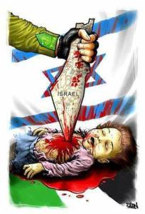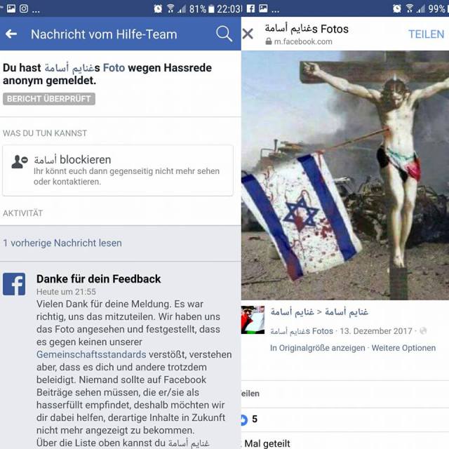 Nach dem erfolglosen Melden derartiger Bilder bekommt man dann jene Nachricht, die links neben dem gekreuzigten Palästinensertuchträger zu lesen ist.