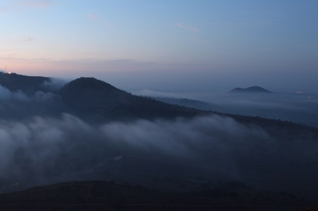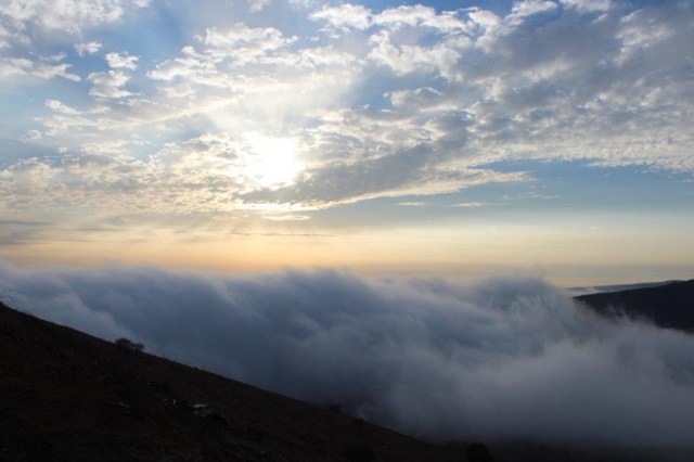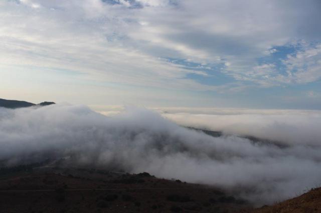 Die Wolken sind etwas darüber, und mit dem Sonnenaufgang senken sich die Wolken herab, man steckt wie in weißer Watte, der Tau fällt aus und man fühlt sich wie gebadet. Wenn dieser dichte Nebel sich weiter senkt, schauen die Gipfel oben aus den Wolken wieder heraus, es bilden sich Ringwolken um die Vulkane, unten in der Ebene wabern sie noch eine zeitlang vor sich hin, bis alle Wolken dann allmächlich in Form von Wasser in der Erde verschwinden, wo es sich unterirdisch sammelt und Richung See Genezareth abfließt, um im Verlauf über viele kleinere und größere Bäche und Flüsse wieder an die Oberfläche zu kommen. Die poröse Lava kann Unmengen an Wasser speichern, und jeden Morgen gibt es Nachschub.